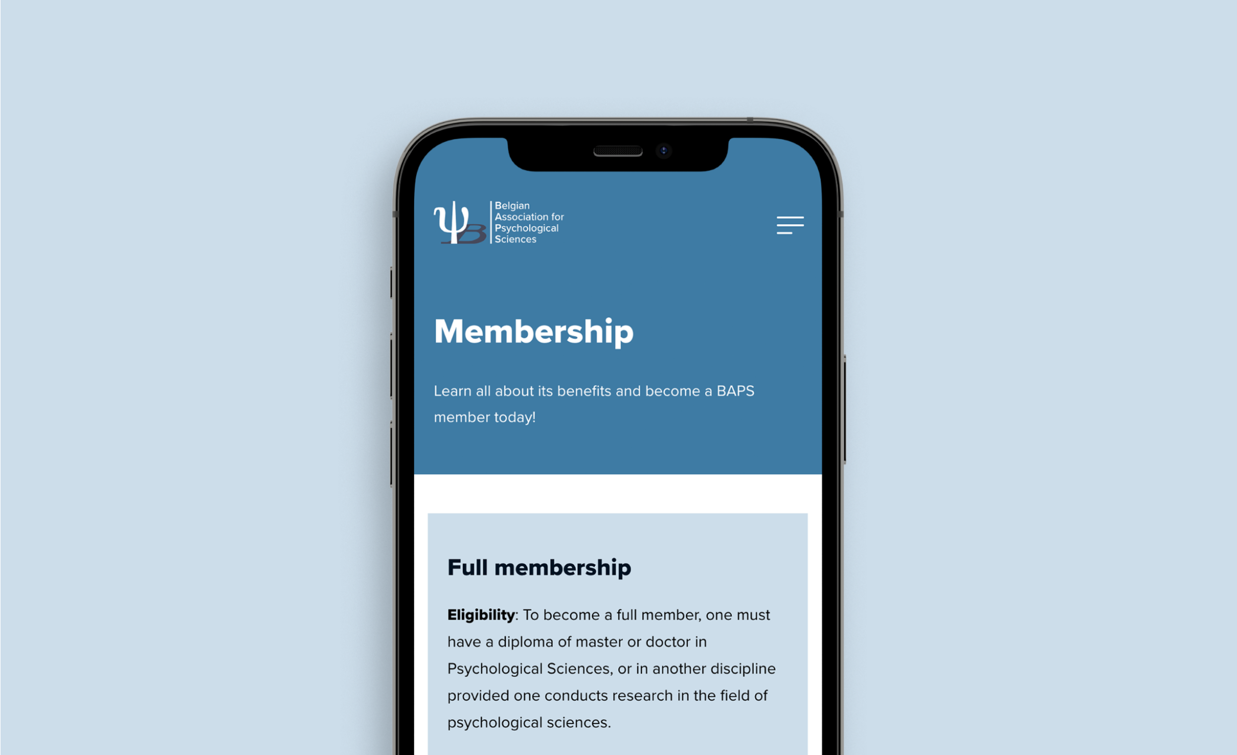 Via gerichte call-to-actions sturen we de bezoeker in de richting van een membership. We geven mee welke voordelen een lidmaatschap heeft en geven informatie over wie al dan niet lid kan worden van The Belgian Association for Psychological Sciences.