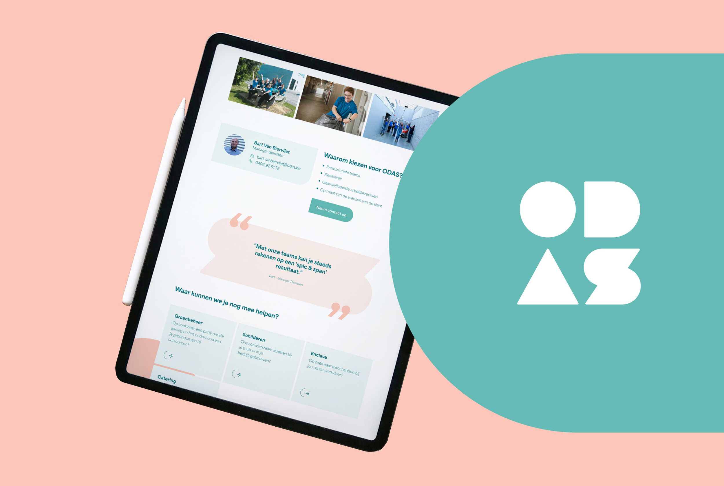 Het ODAS team brachten we op een attractieve manier in beeld en kan doorheen de website gebruikt worden om de juiste contact info te verspreiden. De drempel om contact op te nemen is zo lager voor de bezoeker en bezorgt ODAS meer leads.