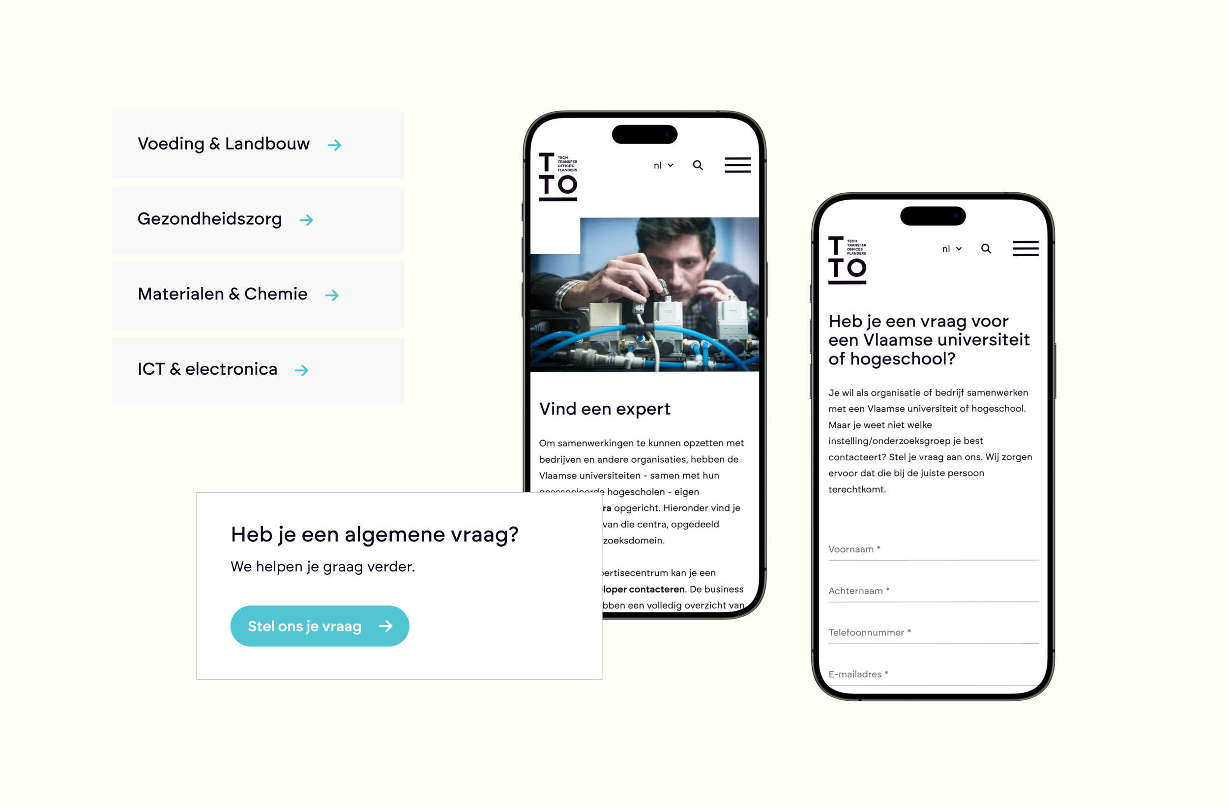 TTO wil innoveren via samenwerking met de industrie en als universiteiten onderling. Via gebundelde krachten zetten de 5 Vlaamse universiteiten (Universiteit Gent, Universiteit Antwerpen, KU Leuven, Vrije Universiteit Brussel en Universiteit Hasselt) maximaal in op samenwerking en kennisdeling. Dankzij een grondige analyse en slimme UI & UX strategie zorgen we dat de verschillende doelgroepen eenvoudig contact kunnen opnemen via verschillende instroompunten. Bezoekers kunnen zich ook laagdrempelig inschrijven op de nieuwsbrief, zo blijven ze op de hoogte van alle nieuwe technologieën en nieuwtjes van de organisatie.