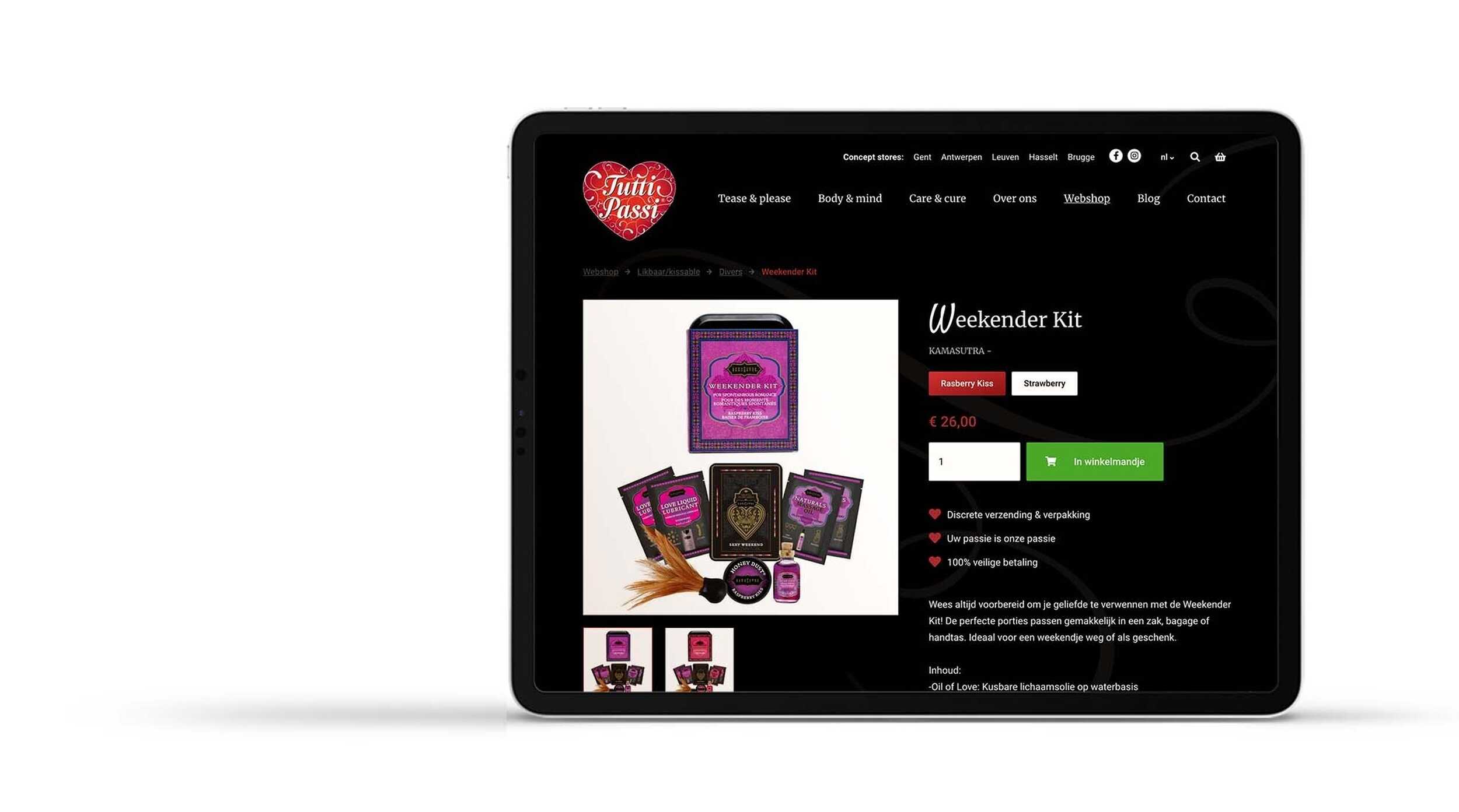 De unieke visie van het bedrijf hebben we nu ook naar het scherm vertaalt. We gingen voor een mysterieus en speels webdesign. Bij Tutti Passi moet je immers niet aankomen met een alledaags design. In de webshop voel je de aanpak van een professionele webwinkel met de eigenheid van Tutti Passi.